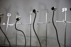 Esta instalación se encarna en la frialdad mecánica y metálica e incorpora lo cinético como un dispositivo de escritura. A la manera de una construcción escultórica de gran purismo estético, semeja un altar. El peso de los cadáveres en la historia argentina específicamente recuerda, de alguna manera, este sentido de sacrificio. El movimiento y la proyección en la pared de las letras de doce veletas replican el título de un poema de Néstor Perlongher, «Hay cadáveres», que, si bien se refiere a Evita, abraza a todos los demás muertos que pueblan nuestra historia reciente, tanto en los tiempos de la dictadura como en democracia, muertos principalmente de la época de plomo y de la corrupción o el crimen”. (Graciela Taquini, Académica de Número, ANBA)