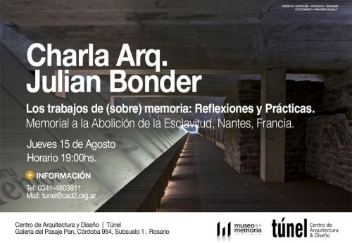 El jueves 15 de agosto, a las 19 h, se realizará la charla Los trabajos de (sobre) memoria: Reflexiones y Prácticas. Memorial a la Abolición de la Esclavitud, Nantes, Francia, a cargo del arquitecto Julián Bonder, en el Centro de Arquitectura y Diseño (Galería del Pasaje Pan, Córdoba 954, subsuelo). La actividad es organizada junto al Colegio de Arquitectos de la Provincia de Santa Fe, Distrito 2 Rosario.