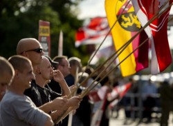 El sábado por la tarde, unos 150 neonazis siguieron la convocatoria del NPD en una de las extensas plazas de Hellersdorf. Buscaban la adhesión de los vecinos “de este precioso barrio” de 75.000 habitantes a través de potentes altavoces. Al otro lado de la plaza y bajo fuerte vigilancia policial, unos 750 contramanifestantes gritaban y pitaban contra el NPD. Las escaramuzas y el nerviosismo se hicieron patentes al principio del acto bajo el sol de agosto. Los nazis formaban, banderas al viento, y el resto de los asistentes se burlaban de ellos con lemas y canciones. Entre ellos, líderes del partido La Izquierda (Die Linke) y de Los Verdes. Die Linke es el partido más votado en la zona.
