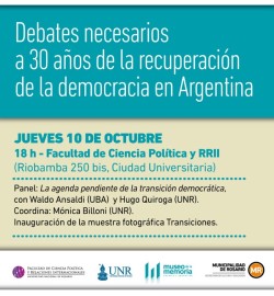 El jueves 10 de octubre, a las 18 h, en la Facultad de Ciencia Política y Relaciones Internacionales de la UNR (Berutti y Riobamba) se realizará el panel de cierre del seminario Debates necesarios a 30 años de la recuperación de la democracia en Argentina, que comenzó en septiembre. En la conferencia final hablarán Waldo Ansaldi y Hugo Quiroga sobre La agenda pendiente de la transición democrática, con la coordinación de Mónica Billoni, e inaugurará la muestra fotográfica Transiciones.