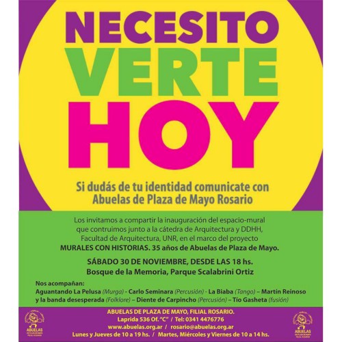Pasado mañana (sábado 30 de noviembre), desde las 18 h, en el Bosque de la Memoria (parque Scalabrini Ortiz), Abuelas de Plaza de Mayo Rosario presentará Murales con Historias. 35 años de Abuelas de Plaza de Mayo, una campaña nacional que lleva adelante Abuelas de Plaza de Mayo en todo el país, y se inaugurará un espacio-mural alusivo.
