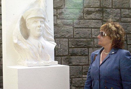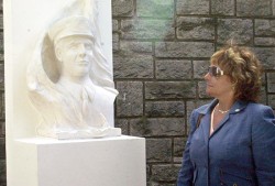 El monumento a Pedro Giachino en el cementerio La Loma, en Mar del Plata. Su viuda en un homenaje en 2008.