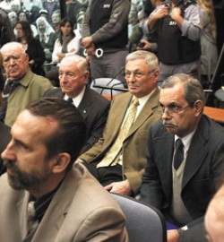 Durante la audiencia, en el primer piso, junto con los periodistas, se ubicaron los familiares de los acusados. Un grupo bastante homogéneo de “gente bien”, como salido de un cacerolazo recoleto a favor de “el campo”. Luego de que terminara la lectura del fallo, mientras en la planta baja había abrazos y caras de satisfacción, se escuchó desde la bandeja superior un “viva la patria”, con voz marcial. Abajo se entonó el “como a los nazis les va a pasar, a donde vayan los iremos a buscar” y se gritó “30 mil compañeros detenidos desaparecidos presentes”. Y hubo aplausos. Después, sobre el escenario, Verónica Castelli, cuyos padres desaparecidos fueron vistos en El Vesubio, le contestó a aquel vozarrón. “Hablo con el corazón en la mano y a carne viva. Es difícil decir que uno está contento. Pero estamos conformes y de pie para seguir. Nos les regalemos la palabra. Hoy mi madre cumpliría 61 años, sólo la dejaron vivir 27. Ella, mi papá y sus compañeros dejaron todo para construir una patria para todos, una patria por la que tenemos que seguir luchando. Esa es la patria.”