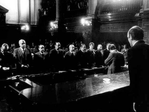 El 22 de abril de 1985 comenzaron las audiencias del Juicio Oral y Público a los miembros de las tres Juntas Militares que gobernaron el país durante la última dictadura, la más cruenta de la historia argentina. Hasta el 14 de agosto del mismo año prestaron declaración testimonial acusados y testigos, citados por las defensas y por el Ministerio Público. Entre agosto y noviembre, se presentaron la acusación preparada por la Fiscalía y los alegatos preparados por las defensas de los ex comandantes.