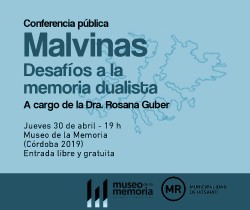 El jueves 30 de abril, a las 19 h, en el Museo de la Memoria (Córdoba 2019), la antropóloga Rosana Guber ofrecerá una conferencia sobre el tema Malvinas: desafíos a la memoria dualista.