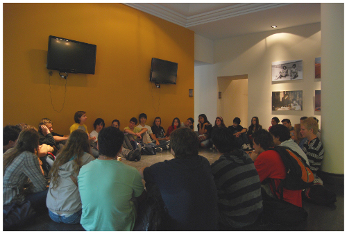 2.- Los alumnos se dividen en grupos, cada uno con un coordinador del Museo, para recorrer los espacios de la institución. En esta etapa, desde la muestra permanente en la planta baja y la terraza, se abordan las diferentes dimensiones de la última dictadura militar, a partir de las distintas instalaciones artísticas: la apropiación de niños, el trabajo de Abuelas sobre el tema de la identidad; operativos de secuestros, traslados, detención en centros clandestinos de detención (CCD), qué era un CCD; desaparición forzada de personas, quiénes desaparecían, diferencia entre desaparecido y asesinado, control de la vida cotidiana (censura, falta de libertad de expresión, de reunión).