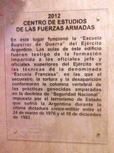 “En este lugar funcionó la Escuela Superior de Guerra del Ejército Argentino”, recuerda la placa, que se instaló en silencio a principios de junio. “Las aulas de este edificio fueron testigos de la formación impartida a los oficiales jefe y oficiales superiores del Ejército en las técnicas de la denominada ‘Escuela Francesa’, en las que el secuestro, la tortura y la desaparición conformaron la columna vertebral de las prácticas genocidas amparadas en la doctrina de la ‘Seguridad Nacional’ impuesta por el terrorismo de Estado que sufrió la Argentina durante la última dictadura cívico-militar, entre el 24 de marzo de 1976 y el 10 de diciembre de 1983”, explica.