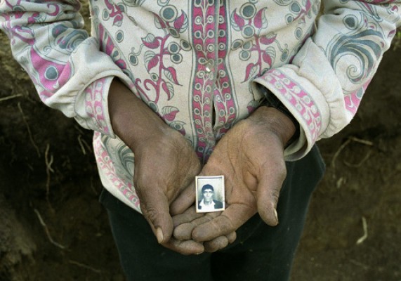 Daniel sostiene una fotografía de su padre, masacrado en 1982. Nebaj, Quiché, Guatemala, 2000.