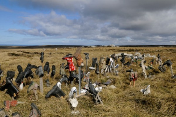 Los calzados que en ella se ven pertenecen a una escultura colectiva en las Islas Malvinas, que fue iniciada por alguien y seguida por otras personas de manera voluntaria.