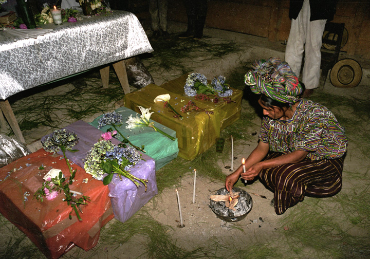María se encuentra en la capilla de la aldea junto a los restos de miembros de su familia, Nebaj, 2000.