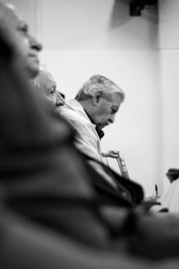 De izq. a der.: Jorge Muñoz, Manuel Fernando Saint Amant y Antonio Bossié, represores, Causa Saint Amant. Rosario, 2012. La fotografía es parte de la muestra temporaria Ante la ley, registro fotográfico de los juicos de lesa humanidad, una producción del Museo de la Memoria expuesta durante julio de 2014 con imágenes capturadas por reporteros gráficos de distintos puntos del país, más fotografías del archivo de Memoria Abierta.