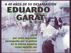 La agrupación Hijos Rosario, el Museo de la Memoria y familiares y amigos de Eduardo Garat, invitan al acto en conmemoración por los 40 años de la desaparición del abogado y militante peronista, que se llevará a cabo el próximo viernes 13 de abril, desde las 19.30, en la emblemática esquina de Moreno y Córdoba.
