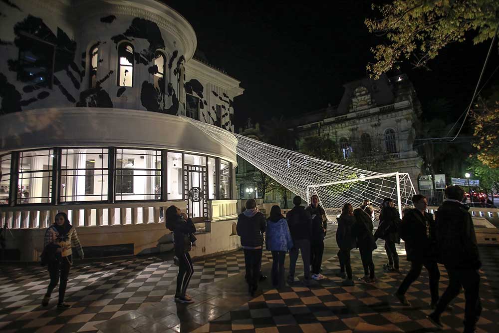 “Horizontes de sucesos” interpela a los transeúntes de Rosario que caminan por la esquina de Córdoba y Moreno exponiendo un gran arco de fútbol y una red blanca que cubre casi la totalidad de la terraza. Según el curador de la intervención, Hernán Camoletto: “La intervención de Diego Figueroa desplaza poéticamente el juego. Del ámbito deportivo al ámbito político. Subvierte la función de un arco que, plantado en un corner de la terraza, es atravesado por un chumbazo que llega desde afuera, desde un juego que se desarrolla en otra cancha. Los tensores, diseñados para proteger a los jugadores, devienen el punto débil, el agujero en la trama por donde se define el ataque. Arrasados los anclajes, revertida su direccionalidad, la red es portal, vórtice, boca de Cronos, agujero negro cuyo campo gravitatorio chupa, retiene, desaparece.”