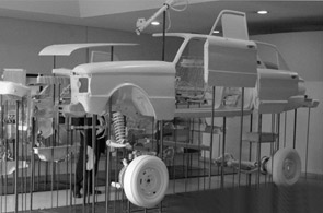 La muestra "Autores ideológicos" presenta, desarmado, un Falcon -de verdad- pintado de blanco. Un trabajo plástico sobre una materia histórica que intenta poner el arte en función mutua con la sociedad y su pasado.