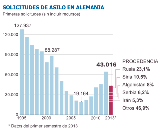 El ministro de Interior de Merkel, el socialcristiano bávaro Hans Peter Friedrich (CSU), calentó los ánimos apenas una semana antes de los enfrentamientos de Hellersdorf: el número de solicitudes de asilo “casi se ha doblado en la primera mitad del año respecto al mismo periodo de 2012”. Friedrich calificó este crecimiento de “alarmante”. Tras los incidentes de esta semana, el ministro acusó a los neonazis de “manchar la imagen de Alemania” y dañar así “a nuestra patria”.