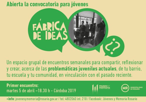 Fábrica de Ideas es un espacio de encuentro para jóvenes que se desarrolla anualmente en el Museo de la Memoria de Rosario y que busca promover instancias de reflexión sobre la participación político cultural juvenil, el intercambio y la convivencia entre jóvenes provenientes de diferentes realidades y la producción colectiva de conocimiento sobre problemáticas de vulneración de derechos en el presente, en articulación con la memoria histórica de violaciones a los derechos humanos.