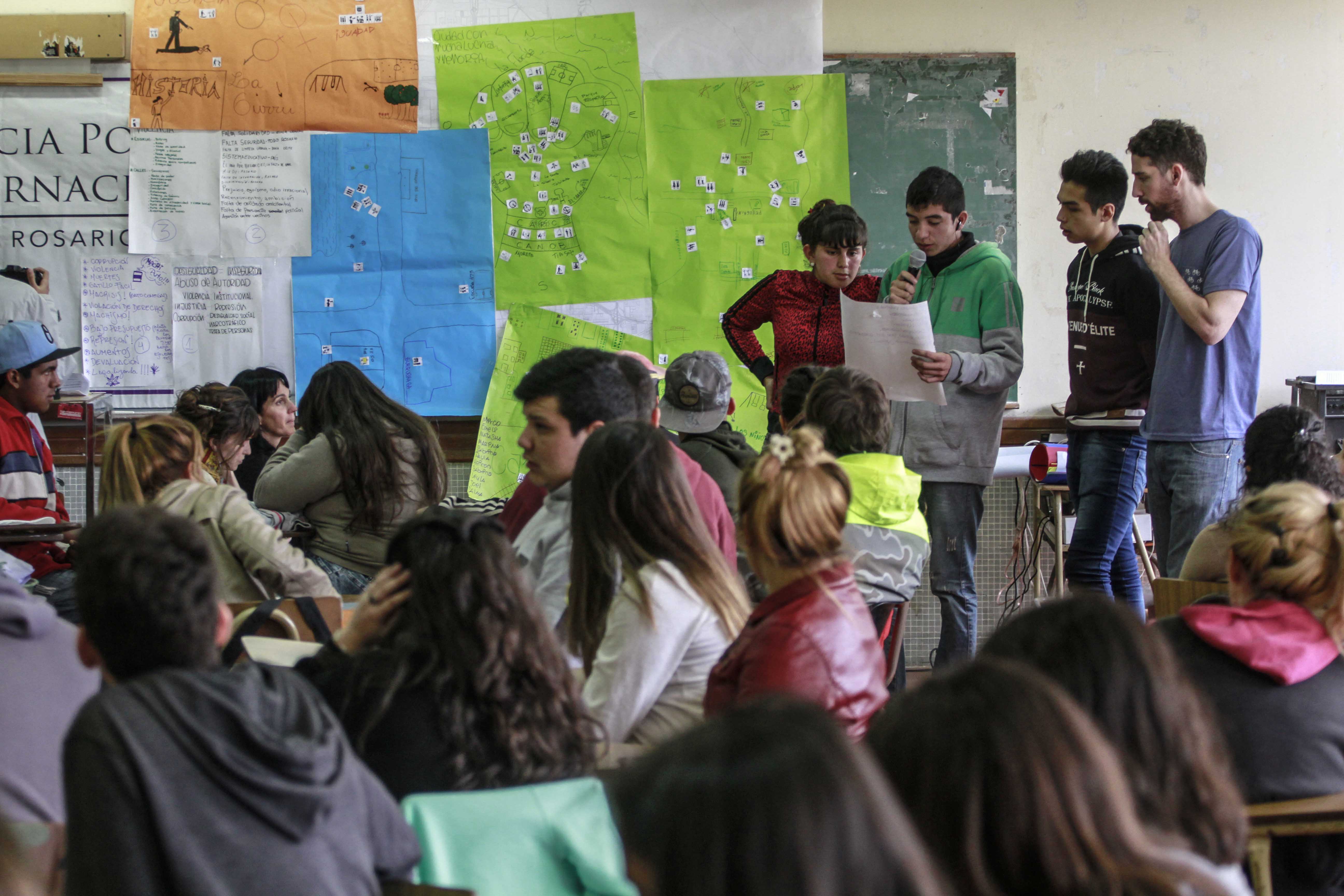 -Proyección de Pibes indeseables. Nos estamos matando entre nosotros. Basta de muertes. Intervención visual y sonora realizada por los jóvenes del grupo Fábrica de Ideas en el marco del Programa Jóvenes y Memoria Rosario 2016.