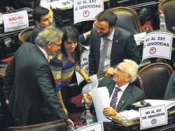 A su turno, Alfonsín caminó por el mismo camino pero valiéndose de otros recursos. Consideró primero que lo realizado por la Corte implica “un retroceso importante”, acusó a los supremos de no haber tomado en cuenta el conjunto de normas, la doctrina y la jurisprudencia internacional. Pero luego avanzó caminando sobre un filo complejo cuando dijo que no podía creer que el PEN haya “interferido” en el voto de los supremos, “no lo puedo creer pero si llegar a ser cierto seré uno de los primeros en denunciarlo”, dijo dejando a sus compañeros de bancada con rostro adusto sin saber si respaldar sus dichos o repudiarlos. Incluso criticó al ministro de Cultura, Pablo Avelluto, quien en un reportaje “frívolo” dijo que las nuevas generaciones no cargan con la mochila de la dictadura militar. “Imaginen que un dirigente de la comunidad judía que las generaciones actuales no tienen que cargar la mochila del holocausto. Esa es una mochila que cargamos toda la humanidad”, dijo subiendo el tono de voz al estilo de su padre y estallaron los aplausos, incluso los del macrismo.