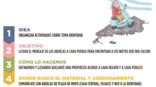 "En cada pueblo, por más chiquito que sea, buscamos que la gente se sume a la tarea, convocándolos a recitales de música, charlas con familiares de desaparecidos, cine por la identidad, actividades deportivas, campañas en redes sociales. Y también queremos llegar a las aulas con obras de teatro, testimonios, juegos, material didáctico, cuentos", explica Sabrina, que vive en Victoria, Entre Ríos, pero va y viene desde allí hasta Rosario, Paraná y otras ciudades del litoral.