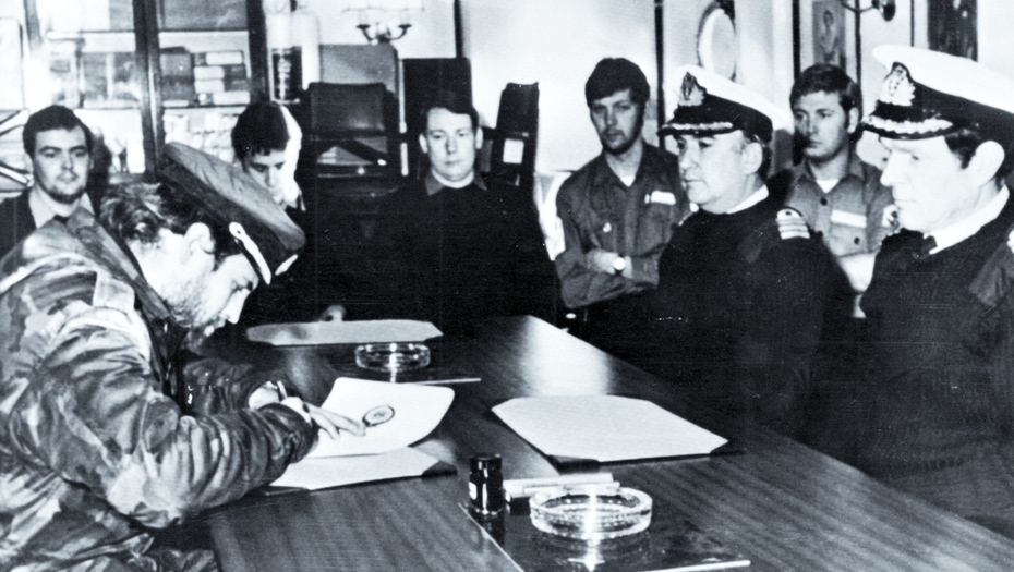 Luego de infiltrarse en Madres de Plaza de mayo y de participar en varios crímenes de Lesa Humanidad, Astiz fue a la guerra de Malvinas. Su actuación allí fue memorable: a las pocas horas de llegar, se entregó sin disparar un solo tiro. La fotografía del momento en el que firma la rendición es uno de los emblemas de la guerra.