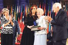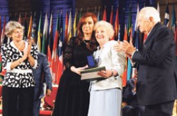 Cuando le tocó el turno a Cristina Kirchner, los argentinos alentaron y aplaudieron de pie. “Hoy estoy aquí en mi doble condición. No solamente como presidenta de la República Argentina, sino como una ciudadana más”, comenzó CFK. “Quiero hacer un homenaje –dijo– en la figura de Estela a todos aquellos que durante muchísimos años reclamaron justicia. Estas mujeres jamás preconizaron o hicieron uso de la violencia. Al contrario, aun cuando casi todos habían perdido las esperanzas, siguieron reclamando ante los tribunales, ante los jueces del país, ante el Parlamento argentino, ante los distintos poderes ejecutivos, justicia, memoria y verdad. Recuerdo haber dicho en mi intervención en la Cámara de Senadores (en el debate por la anulación de las leyes de punto final y obediencia debida) que no sé si a mí me hubieran arrebatado un hijo y no lo hubiera podido ni siquiera llorar o llevar una flor a su tumba, si hubiera tenido la entereza y la fortaleza para reclamar justicia, memoria, verdad en el tono y en la forma en que estas mujeres lo hicieron. Creo que esto es lo distintivo de ellas. No es solamente haber logrado recuperar identidad, sino haber podido persistir sin caer en esas falencias de la condición humana, que son muchas veces los instintos de venganza o de querer hacer justicia por la propia mano. Nada más alejado de estas mujeres que parecían muy débiles, que algunos calificaron de locas y creo que eran las más cuerdas y las más racionales en aquellos momentos en la Argentina.”