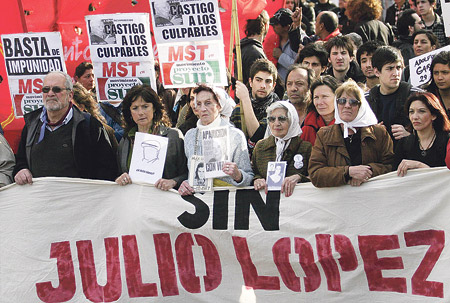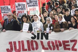 “Cada 18 sentimos el mismo dolor que aquella mañana en que Julio no aparecía, cuando a las pocas horas presentábamos el hábeas corpus y decíamos que había que buscar a los secuestradores en Marcos Paz y en la Bonaerense, pero lo grave es que testigos como López se presentan, exponen su historia y su integridad física como él, mientras que son cada vez más los acusados y condenados van quedando en libertad”, dijo a Página/12 Myriam Bregman, abogada de López en el juicio contra Etchecolatz y candidata del Frente de Izquierda. “La experiencia de Julio López marca que los genocidas tienen que estar en la cárcel, que el aparato represivo de la dictadura sigue impune y en funciones, como demostramos en la causa ESMA, que 3100 suboficiales de la Marina de esa época están en actividad, así como 9 mil policías en la Bonaerense. Todo esto sobreexpone enormemente a los testigos y nadie puede hablar de protección si todas estas personas siguen impunes y en sus casas”, agregó.