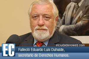 El secretario de Derechos Humanos de la Nación, Eduardo Luis Duhalde, falleció hoy en Buenos Aires, a los 72 años, se informó oficialmente. Duhalde fue designado en la Secretaría de Derechos Humanos por el ex presidente Néstor Kirchner al asumir en 2003, y ratificado por la presidenta Cristina Fernández de Kirchner en 2007 y en su segundo mandato, en 2011.