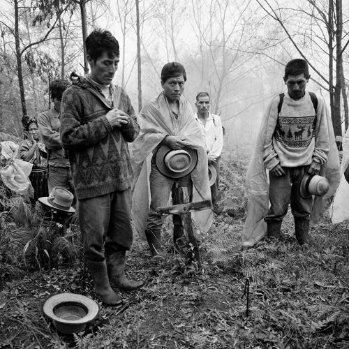Líderes comunitarios ofrecen una oración al inicio de una exhumación en el sitio de un cementerio clandestino localizado en las montañas cercanas a la población de Nebaj, Quiché, Guatemala, 2000.