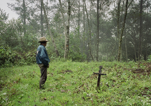 Don Samuel inspecciona el área en el bosque donde había enterrado a sus cuatro hijos. Dos de ellos fueron asesinados por el Ejército y dos murieron de hambre y enfermedad mientras se encontraban refugiados en estas montañas 15 años atrás. Treinta personas fueron enterradas en esta área inmediata. Como si sólo hubiera esperado recuperar los restos de sus hijos, don Samuel falleció un mes después de la exhumación. Xexocom, Nebaj, Quiché, 2000.