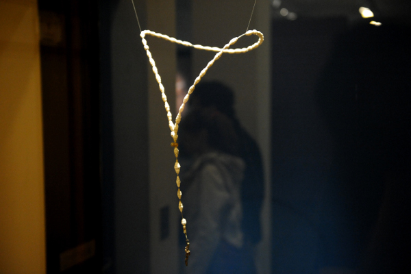 Sobre un alma de cable de acero se enhebran cuentas de papel plegadas y enrolladas sobre si mismas y que contiene impreso el listados de personas desaparecidas por el Terrorismo de Estado Argentino, publicado por la CONADEP en el libro “Nunca más”, Buenos Aires, Argentina.