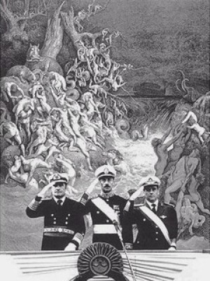Collages que dan cuenta de las conexiones entre la represión religiosa y el Terrorismo de Estado. Imágenes del siglo XIX, el infierno de La divina comedia, escenas del juicio final y obras de Gustave Doré, entre otros, fueron mezcladas con fotografías de personajes de la jerarquía religiosa y militar de la última dictadura cívico militar argentina.