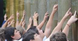 "Pilares de la memoria", obra que contiene los nombres de los desaparecidos, recorrida por los chicos. (Foto: S. Suárez Meccia)