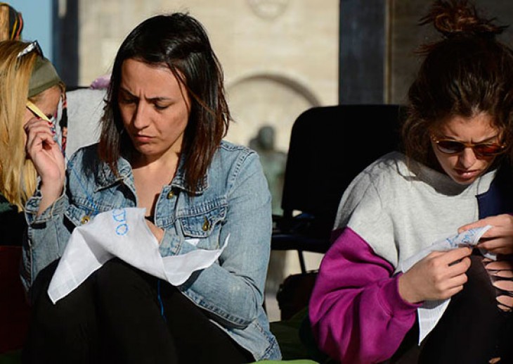 Los nombres de los desaparecidos, presentes hilo por hilo en la Semana por la Identidad. Las voluntarias bordaron los nombres en la soleada tarde de ayer.