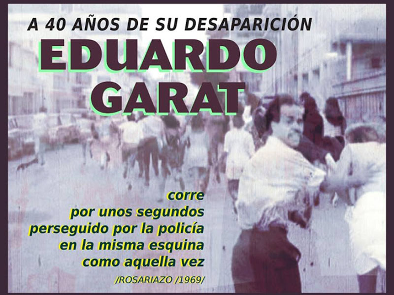 La agrupación Hijos Rosario, el Museo de la Memoria y familiares y amigos de Eduardo Garat, invitan al acto en conmemoración por los 40 años de la desaparición del abogado y militante peronista, que se llevará a cabo el próximo viernes 13 de abril, desde las 19.30, en la emblemática esquina de Moreno y Córdoba.